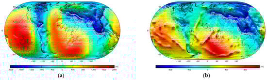 Global maps of (a) the geoid heights [m] and (b) the free-air gravity disturbances [mGal = 10−5 m·s−2] computed with a spectral resolution complete to a spherical harmonic degree of 180 by using the EIGEN-6C4 global gravitational model [28].