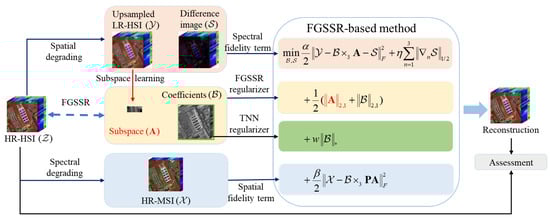 Flowchart of the proposed fusion method. Note: Since the subspace is obtained using the subspace learning strategy from LR-HSI, the objective function no longer includes separate terms related to . The appearance of in this flowchart is intended to facilitate understanding.