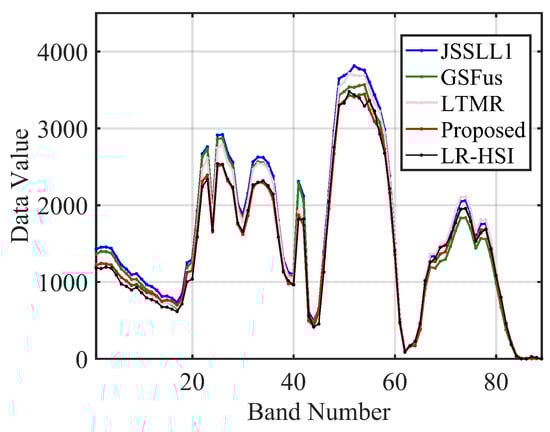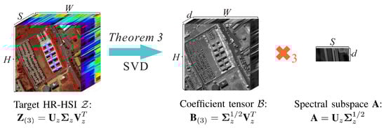 For the latent HR-HSI, there is typically a significant correlation among spectral vectors. This indicates that spectral vectors in the latent HR-HSI often reside within a low-dimensional subspace [,,]. Hence, the latent HR-HSI can be approximated by adopting a subspace representation strategy, that is,