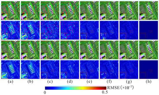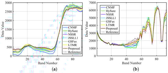 Parameter w is utilized to constrain the TNN regularization term. To examine the effectiveness of the TNN regularization term, the proposed FGSSR-based method is applied to the simulated PU and WDCM datasets using varying values of w. Figure 9e illustrates the PSNR curves corresponding to various values of parameter w. According to Figure 9e, the PSNR values for both the simulated PU and WDCM datasets show increasing trends as w increases. This demonstrates that the TNN regularization applied to the low-dimensional coefficients enhances the ability of the proposed method in capturing spatial self-similarity features, ultimately leading to improved HR-HSI reconstruction. Additionally, the optimal outcomes for both of the two simulated datasets are attained when the value of w lies within the interval of . Taking this into consideration, is selected as the optimal value for the proposed method in all experiments.
