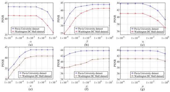 is a proximal parameter that ensures the theoretical convergence of the PAM solver, while parameter serves as a penalty parameter. Figure 9f,g display the PSNR of the fused results for the simulated PU and WDCM datasets as functions of and , respectively. According to Figure 9f,g, the optimal results for both of the two simulated datasets are achieved when the value of is within the interval of , while the value of is within the range of . Based on these observations, and are set for the proposed method in all experiments.