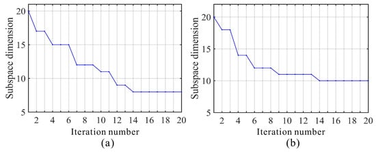 Variation of the subspace dimension d as the iteration increases. (a) The simulated PU dataset, and (b) the simulated WDCM dataset.