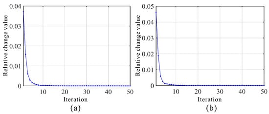 Figure 11 illustrates the variation in relative change (Rech), defined as , of the FGSSR-based method on the simulated PU and WDCM datasets as the iteration progresses. As shown in Figure 11, the Rech quickly converges to zero within a few iterations, demonstrating the fast and favorable numerical convergence of our FGSSR-based method.