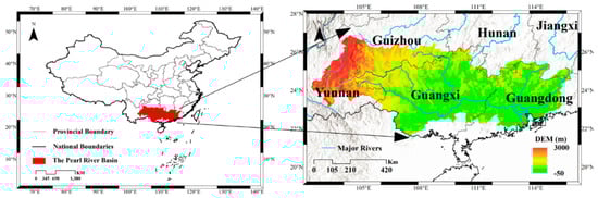 The PRB is one of China’s major basins and is located in the southern part of the country (Figure 1). The PRB covers an area of approximately 4.42 × 105 km2 [57] and is higher in the west and lower in the east. There are primarily three major tributaries in the PRB: the West River, the North River, and the East River [58]. Precipitation is mainly concentrated from April to September [58,59], and hydrological drought is more severe compared with meteorological drought [60]. Situated below the population density line in China, the PRB has a high population density and robust socioeconomic development. Hence, the potential harm inflicted by drought in this region would be substantial, which makes it a matter of significant concern. Despite being a coastal region, the PRB should pay close attention to water security because of recent increases in global warming and the frequency of droughts.
