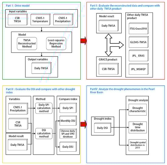 In this study, we reconstructed the daily TWSA using meteorological data as well as CSR–TWSA; the meteorological data are provided by CN05.1. The reconstruction model was based on a statistical method, and the parameter of this method was calculated by the MCMC. Then, the quality of this reconstructed TWSA was analyzed in comparison with other daily TWSA products, including ITSG-Grace2018, GLDAS_TWSA, JPL_ERA5, and JPL_MSWEP, aimed to validate the feasibility of the reconstruction method. The DSI was calculated at the daily resolution using the reconstructed daily TWSA, and the calculated DSI was compared with SPI and SPEI. Finally, we calculated the drought characteristics to analyze the drought temporal distribution on a daily resolution from 2003 to 2021 and to analyze the drought special distribution in 2011 (Figure 2).