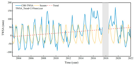 where a is the constant term, b is the trend term, c, d, e, and f denote the seasonal term, and ε denotes the residual term [70]. The parameters were obtained by the least-squares regression method. Figure 3 displays the time series as well as the trend and seasonal terms of TWSA in the PRB, which were calculated by the aforementioned method.