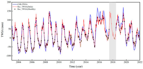 Time series of TWSA driven from CSR and reconstructed TWSA in this study. The vertical gray shading area denotes long-term missing data of GRACE.