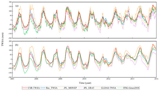Time series of each daily TWSA product and CSR–TWSA; (a) CSR–TWSA and all daily TWSA products; (b) CSR–TWSA and each daily TWSA product averaged into the monthly scale that is consistent with the GRACE “month”.