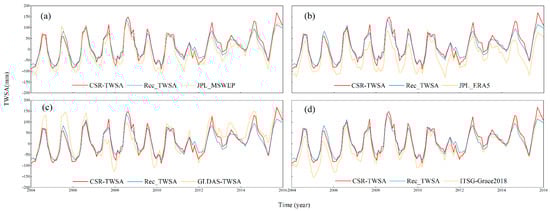 Time series of each daily TWSA product and CSR–TWSA; (a) time series of CSR–TWSA, reconstructed TWSA and JPL_MSWEP; (b) time series of CSR–TWSA, reconstructed TWSA and JPL_ ERA5; (c) time series of CSR–TWSA, reconstructed TWSA and GLDAS-TWSA; (d) time series of CSR–TWSA, reconstructed TWSA and ITSG-Grace2018.