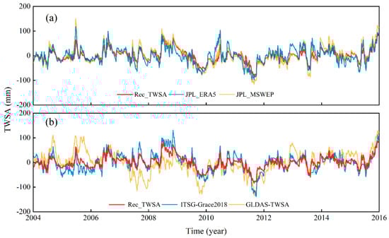Comparison of different daily TWSA products after removing trend and seasonal terms; (a) time series of reconstructed TWSA in this study, JPL_ERA5, JPL_MSWEP; (b) time series of reconstructed TWSA in this paper, GLDAS-TWSA, ITSG-Grace2018.
