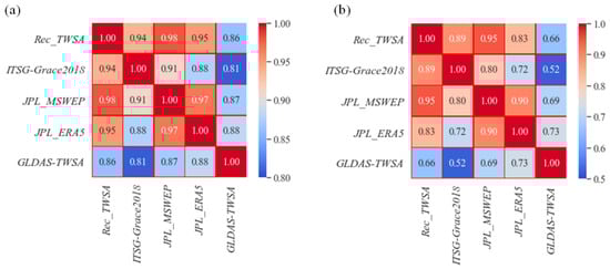 (a) CC between different daily TWSA products and (b) CC between different daily TWSA datasets with seasonal and trend terms removed.