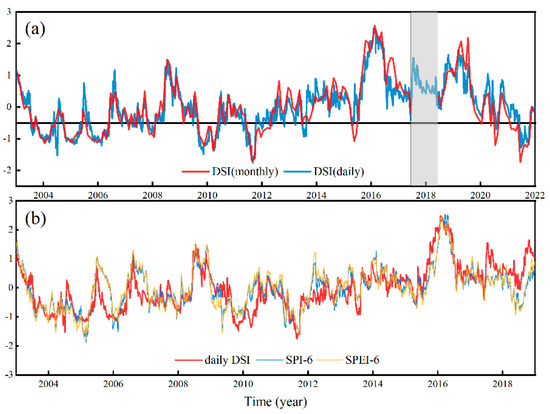 Time series of different drought indices in the PRB; (a) time series of monthly DSI and daily DSI; (b) time series of daily DSI, daily SPI-6, and daily SPEI-6.