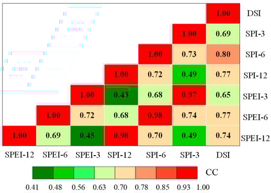 There is a certain correlation between different drought indexes (Figure 10). The daily SPI and daily SPEI here are used from datasets provided by Wang et al. [66,67]. SPI-3 indicates daily SPI on a 3-month time scale (180-day scale). Similarly, SPI-6, SPI-12, SPEI-3, SPEI-6, and SPEI-12 follow the same pattern. The CC between DSI and other drought indexes at all time scales is above 0.65. Among them, the DSI and SPI-6 have the highest CC of 0.8. SPI and SPEI correlated over 0.95 on the same time scale. There is a certain correlation between different indices and differences, mainly due to the different perspectives of various drought indices in monitoring drought. The CC reflects the consistency of different drought indices in monitoring drought from different perspectives. DSI has the highest correlation with SPI-6 and SPEI-6, and Figure 1 shows the time series of SPI-6, SPEI-6, and DSI. Depressions are present in both SPI-6 and SPEI-6 on the dates when the DSI recorded a drought event (Figure 3), producing a wetting peak in all three indices in 2016. In summary, daily DSI is not only highly consistent with monthly DSI but also with daily SPI and daily SPEI, reflecting the reliability of daily DSI.