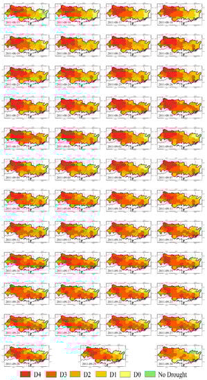 The drought that occurred from May 27, 2011, to October 12, 2011, has the lowest minimum recorded by DSI. This study analyzes the spatial distribution of this drought event in detail. The “2011 Bulletin of Flood and Drought Disaster in China” [75] shows that the peak of the drought was in early September 2011, and the specific date of the peak of this drought recorded by DSI is 31 August 2011, with a peak value of −1.76, which is only one day different from the government recorded drought. Figure 11 shows the spatial distribution of drought monitored by DSI from 15 August 2011 to 30 September 2011. During the entire period, the PRB experienced a severe drought, with the most intense drought occurring at the tri-provincial junction of Yunnan, Guangxi, and Guizhou, and the central part of Guangdong also being significantly affected by drought. The overall drought showed a slow aggravation trend in August, and the area of D4 kept expanding. The whole drought process is spreading from west to east, reaching its peak on 31 August. The drought in the part of Guangxi, Yunnan, and Guizhou in the PRB improved slightly after 3 September but was still in a drought situation. The drought level in the whole PRB appeared to be significantly reduced on 30 September. The “2011 Bulletin of Flood and Drought Disaster in China” [75] shows that the drought was relieved by an effective precipitation process in Guangxi, Yunnan, and Guizhou in mid to late September, but the drought did not lift directly. The DSI shows that the drought in the three provinces did show a drought relief process in mid to late September, and the drought in the entire PRB was significantly reduced by the end of September 2011, which is more consistent with the description in the “2011 Bulletin of Flood and Drought Disaster in China” [75].