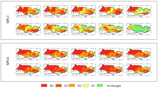 Drought distribution in the PRB monitored by SPI-1 and SPI-6 from 15 August to 30 September 2011.