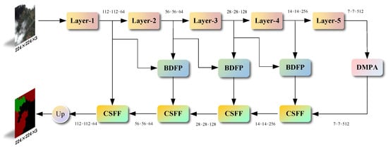 The accuracy of the feature extraction of cloud and cloud shadow directly affects the accuracy of the final classification. In order to ensure the performance of the model, we reduce the image size in the encoding stage, increase the number of channels, and increase the dimension of information. In the decoding stage, the image size is enlarged and restored, and the number of channels is reduced to the same as the number of channels that begin to enter, to ensure that the loss of image information is minimized and the performance of the model is ensured. In this work, we use ResNet18 as the backbone network to extract information and then propose the DMPA module to extract deep semantic information and channel spatial information at the deepest layer of the network to help classify clouds and cloud shadows and accurately capture them. Secondly, the BDFP module is proposed between the encoder branch and the decoder branch to perform jump connection between the two branches. The BDFP module not only promotes the two adjacent layers of the backbone network to guide each other for feature mining but also fully fuses the feature information and inputs it into the decoder branch in order to provide more useful features for the decoding stage and better restore the detail information. In the decoding stage, the CSFF module is proposed to fuse deep semantic information and shallow detail information. After sufficient feature information fusion and extraction, it makes up for the loss of some feature information when recovering the size on the picture in the decoding stage. The CSFF module gradually fuses features from deep to shallow to restore high-resolution details, which greatly improves the performance of the network. Finally, double upsampling is performed to restore the image to the original size output.