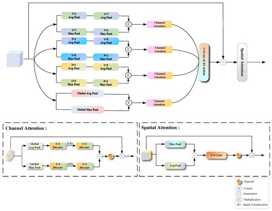 where denotes the Sigmoid function. represents splicing in the channel dimension, Max pooling is represented by Mp, and average pooling is represented by Ap.
