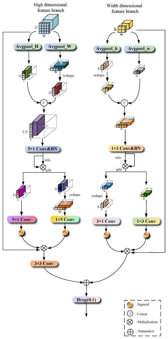 In Formula (6), represents the concatenation operation along the high dimension. is the feature map obtained after concatenation along the height dimension. Then, a 2D convolution with a kernel size of 5 × 1 is applied, performing convolutional operations along the vertical direction for each position’s pixel to capture features along the height dimension comprehensively. Subsequently, the resulting feature map is processed through batch normalization and then ReLU activation function to reweight the features. It is then element-wise multiplied with the weight obtained from the vertical strip convolution of the high-dimensional features. This process is illustrated by Formulas (7) and (8):