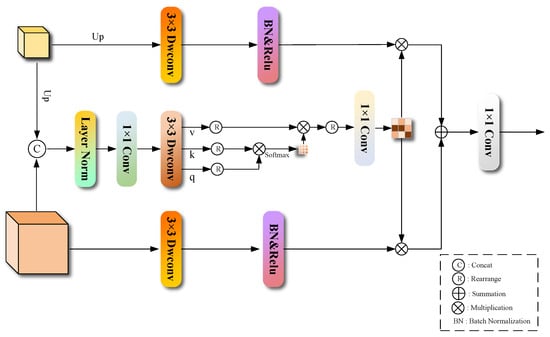 where is the feature map of the self-attention branch output. , , and are obtained from the original size remodeling tensor. Before the Softmax function, the point product size of and is controlled by the learning scaling parameter in this instance. is a Softmax function. R is a symbol for the rearrange operation. For the convolution branch of the CSFF module, the feature map of after upsampling and are input into the depthwise separable convolution with the 3 × 3 convolution, batch normalization, and Relu, respectively, and output as and , respectively. The procedure described above is as follows: