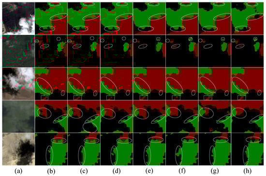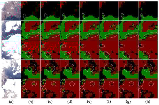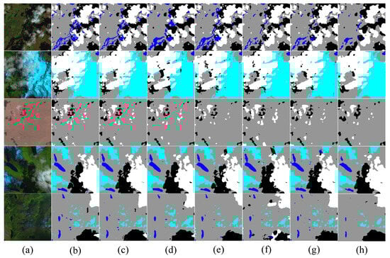 Comparing the segmentation outcomes of several networks in various environmental contexts using the cloud–cloud shade dataset. (a) Images; (b) labels; (c) MSFANet; (d) PSPNet; (e) ENet; (f) BiseNetV2; (g) DeepLabV3plus; and (h) Swin_Transformer.