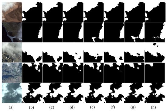 In order to further verify the generalization performance of the proposed algorithm, we use the high-resolution cloud dataset HRC_WHU [] for verification. Images of this dataset were collected from Google Earth. Experts in the field of remote sensing image interpretation of Wuhan University have digitized the relevant reference cloud masks. The dataset contains 150 high-resolution remote sensing images of large scenes. Each image contains three channels of RGB information, distributed in various regions of the world, including deserts, snow, urban, forest, and water. There are five different backgrounds. The image resolution is mainly between 0.5 m and 15 m. The original size of the image is 1280 × 720. Due to the memory limitations of the GPU, we cut the original image into 256 × 256 small-size images for training. After screening, we obtained a total of 5200 images, which were divided into training sets and verification sets according to 8/2. In order to enhance the generalization ability of the model, we performed data augmentation operations through translation, flipping, and rotation. After data augmentation, the data set was expanded to 16,640 training set images and 4160 verification set images. The ratio of the training set and the verification set is still 8/2. Figure 8 shows some images in the HRC_WHU dataset. There are two types of dataset labels: cloud (white) and background (black).