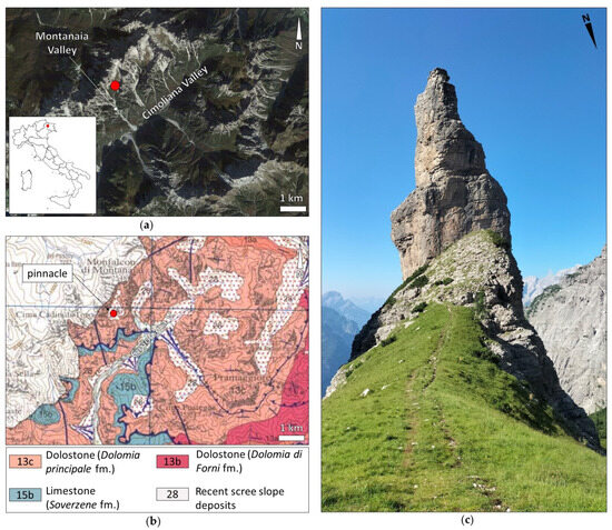 Geographical and lithological overview of the study area. (a) Satellite imagery (2019 Mapbox) showing an aerial view of the study area. The location of the pinnacle is marked by the red dot. In the inset, the location of the study area in Italy is shown. (b) Geological map of the study area (original scale 1:150,000, from [24]) showing the distribution of the calcareous formations that characterize the area. (c) South-looking view of the “Campanile di Val Montanaia”. The height of the pinnacle on the side visible in the photo is about 120 m. On the opposite side, due to the morphological configuration and orientation of the slope, the height from the base is about 240 m.
