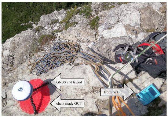 In the picture is an example of chalk-made GCP surveyed through GNSS: note that the small tripod was set-up by eye, with an estimated error within a couple of centimeters. The antenna height was measured using a tape measure, considering about 0.5 cm uncertainty due to the tape flexibility and the surface roughness. Additionally, the figure also shows the portable seismometer Tromino Blu in acquisition on the same ledge during the ascent.