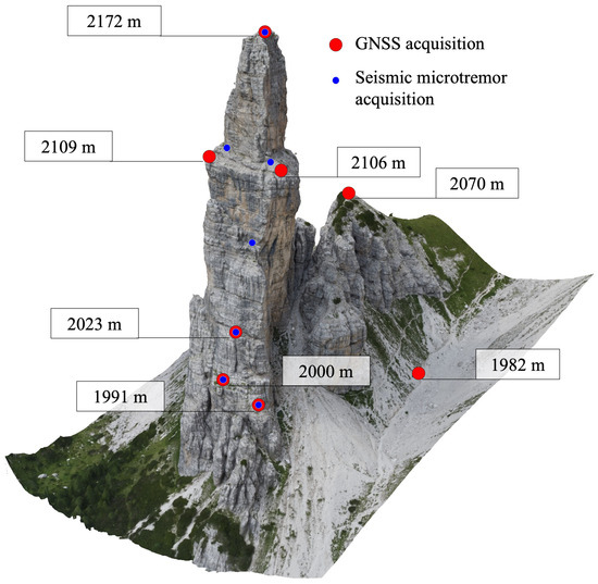 Position on the rock pinnacle of the surveyed GCPs (red dots) and of the seismic microtremor acquisitions (blue dots). The image is a preview of the texturized 3D model obtained via SfM procedure of the “Campanile di Val Montanaia”.