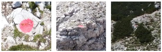 The drone was flown from the ground base at various intervals during the day in order to have various optimal light conditions and good exposure of the acquired pinnacle side. An attempt was therefore made to take images of the slopes in the shade, following the movement of the sun throughout the day, to mitigate the presence of significant luminous contrast in regions immediately exposed to sunlight. To allow for a better reciprocal positioning between the radio control and the UAV, the drone’s take-off took place from different positions, considering that a flight behind the rocky mass would have immediately caused a loss of signal.