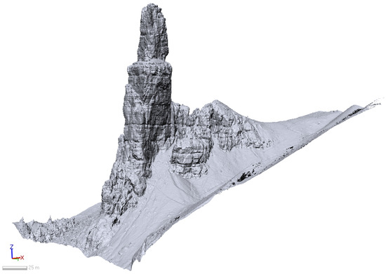 The dense point cloud generation took 2 h and 44 min considering the “medium quality” level, 5 h and 48 min for the “high” quality model, and, finally, 14 h and 35 min using the “ultra-high” quality parameter. The focus on the “depth filtering” mode should be evaluated considering that it is a means of removing noticeable outliers while preserving as much as possible the detailed elements of the three-dimensional model, which are crucial for subsequent analysis. The test demonstrated that, in the case of the Montanaia rock pinnacle, which is characterized by highly irregular shapes, the optimal trade-off between excluding outliers and preserving model complexity falls within the “moderate” filtering level. Moreover, if setting the parameter to “aggressive”, the computational time for such a model increased dramatically. Therefore, all the results discussed in the following are related to dense point clouds computed using a “moderate” depth filtering. An example of the model produced with the SfM processing method is shown in Figure 6, where the mesh, which automatically closed the holes, is depicted. The textured model is reported in Figure 7, where the specific areas subject to the geo-mechanical analysis are also highlighted.