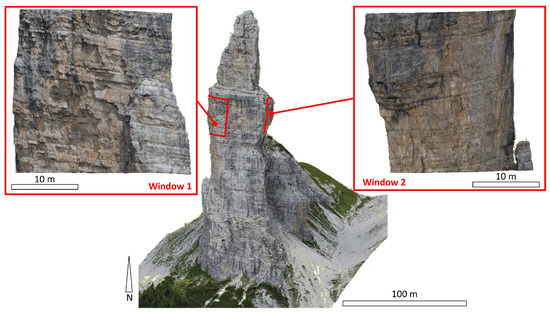 The windows are located on opposite sides of the Campanile (Figure 7). Window 1 (W1) is located on the western side of the pinnacle and includes its south-western corner. Window 2 (W2) is located on the eastern side and includes the north-eastern corner of the pinnacle. The inclusion of a corner within each window was deliberate and intended to exploit the three-dimensional configuration of the object to provide (a) an improved geometrical constraint in deriving discontinuity orientation data and (b) to limit the orientation bias that typically affects discontinuity mapping performed on outcrops characterized by a single orientation. The square windows W1 and W2 are characterized by a 35 m and a 32 m side, respectively. The point counts for W1 are 131,202 for the medium-quality model, 593.084 for the high-quality model, and 3,259,078 for the ultra-high-quality model. The point counts of W2 are 93,736 for the medium-quality model, 400,181 for the high-quality model, and 1,924,666 for the ultra-high-quality model.