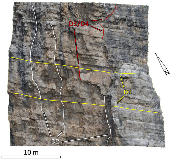 View of selected discontinuities from sets D1, D2, and D3/D4 mapped within window W1. D3 and D4, in this case, were not separated due to the similarity in orientation, which makes the classification of single features challenging.