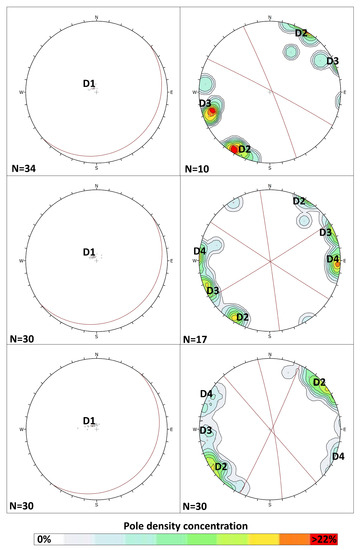 Table 1 summarizes the results of the discontinuity mapping performed on each window. In most cases, four discontinuity sets were observed. The most represented set is the stratification of the dolostone deposit (D1), which dips with a low angle (typically, less than 10°) in an eastern to south-eastern direction. The other sets (D2–D4) are constituted by high angle, sub-vertical discontinuities that strike in a north–east, north, and north–west direction, respectively, (Figure 8). The Fisher’s K value [38], which is a value that describes the dispersion or tightness of a cluster of points, is also reported for each set. A smaller K value indicates a greater dispersion of the set, whereas a greater K value indicates a tighter cluster.