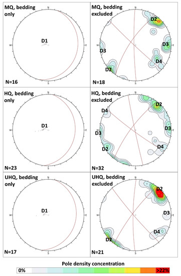 Stereonet obtained from the discontinuity mapping performed on the medium-quality (MQ), high-quality (HQ), and ultra-high-quality (UHQ) models of window 1. For each model, two stereonets are presented, which include poles and great circles for bedding planes only (D1) and the sub-vertical discontinuity sets (D2–D4). The stereonets showing the sub-vertical discontinuity sets also show the pole density concentration. Note the progressive increase in mapped features (indicated by the value N) with increasing model quality.