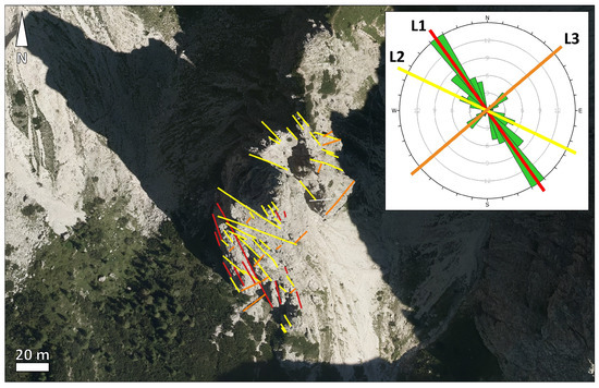 The orientation of the observed discontinuity sets displays a good correlation with discontinuities and structural features at the scale of the entire pinnacle. Figure 11 shows a nadiral orthophoto of the area of the pinnacle, retrieved from the Friuli Venezia Giulia air photo repository (https://eaglefvg.regione.fvg.it, accessed on 10 July 2023), on which the traces of sub-vertical structural lineaments have been outlined. Two major lineament trends (L1 and L2) can be observed striking in approximately a NW–SE direction, which can be correlated with discontinuity set D2. A third, minor lineament trend, striking in a NE–SW direction, can also be observed, which correlates with discontinuity set D4. The agreement between the orientation of the lineament and the sub-vertical discontinuities (except for discontinuity set D3, which does not display clear correlations with any lineament trend) emphasizes the role of structural geology in controlling the morphology of the Campanile, and possibly its long-term evolution and stability.