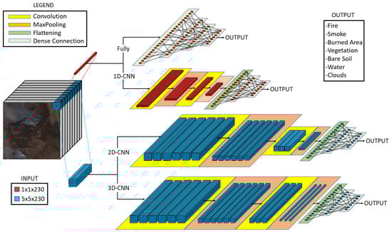 Figure 10. It can be observed that all models accurately identify the burned areas in the upper right of the image, as well as successfully detect the three small pastoral fires. However, a notable discrepancy arises in the FC and 1D-CNN models, where a higher number of pixels are mislabeled as smoke in comparison to the 2D and 3D networks. In this context, the 2D and 3D CNN models demonstrate superior performance in image classification compared to the FC and 1D models, although they still face challenges in distinguishing smoke from shadows. This issue is more prominent in the 2D and 3D models. The underlying cause is the model’s limited ability to recognize shadows, which leads to confusion with the smoke spectrum, the closest known spectrum in this scenario. Furthermore, similar to the observations made in Oregon, all models except the 3D-CNN exhibit a tendency to detect relatively large fires near the burned areas, which do not actually exist. As a result, the 3D-CNN model emerges as the most reliable in accurately discerning real wildfires from false positives. Its advantage lies in its capability to recognize complex spatial features, especially in differentiating between the burned and fire classes where confusion is most prevalent. In conclusion, the 2D and 3D models, which integrate spatial information, demonstrate improved performance in smoothing and denoising image classifications.