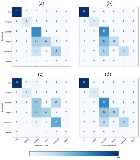 Figure 6 presents an example of a confusion matrix for the test dataset, offering a more comprehensive evaluation of each model’s segmentation performance. Notably, all models demonstrate accurate recognition of both the fire and smoke classes, with one exception being the 2D-CNN model. In the case of the 2D-CNN model, specific pixels categorized as the fire class are erroneously classified as the burned class, and similarly, certain pixels from the smoke class are also misclassified as the burned class.