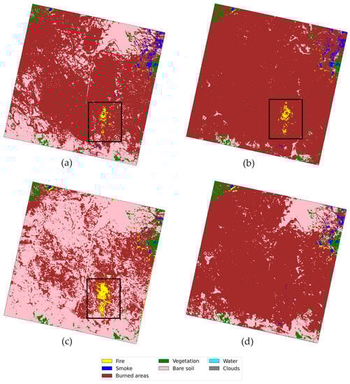 Figure 9 shows the results of transfer learning conducted in Oregon, presenting the predictions of the overall region for each analyzed model. Notably, the differences discussed in the confusion matrix are clearly evident. Moreover, the results obtained seem to suggest the presence of a significant active fire in Oregon, indicated by the black boxes in