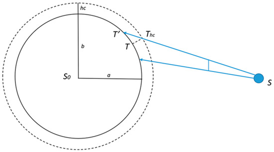 Through utilizing the satellite coordinate   S 1   ( X S 1 , Y S 1 , Z S 1 ) and the projection coordinate   T E   ( X E , Y E , Z E ) of the detection point, the coordinates of detection point T in the spatial Cartesian coordinate system can be determined and represented as point   T 1   ( X S 2 , Y S 2 , Z S 2 ) .
