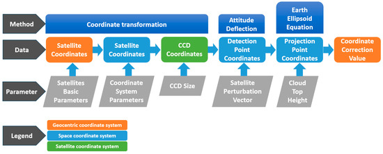 Figure 2. Computational workflow of ECPC model for lightning localization using a stationary satellite. The different colored boxes in the image represent the coordinates in their respective coordinate systems, with orange indicating geocentric coordinate system, blue indicating space coordinate system, and green indicating satellite coordinate system.