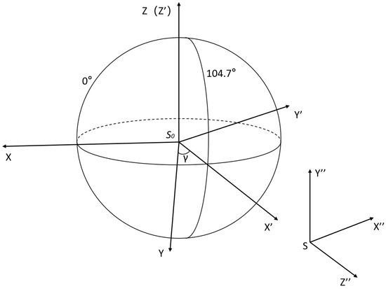 For computational convenience, a spatial Cartesian coordinate system is established with the Earth’s center   S 0   ( X 0 , Y 0 , Z 0 ) as the origin. The X-axis is aligned with the line connecting the Earth’s center and the point where the equator intersects with the meridian at 104.7°E. The Y-axis points in the direction of the satellite’s heading, and the Z-axis points towards the North Pole. This configuration is illustrated by the X′, Y′, and Z′ axes in Figure 3. The coordinates of the instrument S in the geocentric coordinate system, represented by point   S   ( X S , Y S , Z S ) , are transformed into the coordinates   S 1   ( X S 1 , Y S 1 , Z S 1 ) in the spatial Cartesian coordinate system.