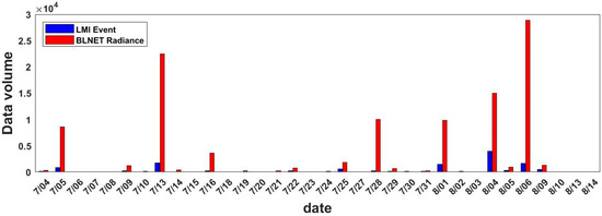 The study area is selected within the effective coverage range of the BLNET (115.5°E~117.5°E, 39.5°N~41°N), as depicted in Figure 5. The figure illustrates the detection count of FY-4A LMI events and BLNET radiation events during the summer of 2019. On the dates included in the statistics, the LMI detected a total of 12,660 events, while the BLNET detected a total of 107,294 radiation events. The overall detection efficiency of the LMI is 11.799% of the BLNET.