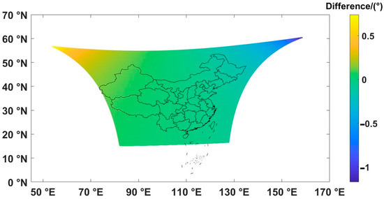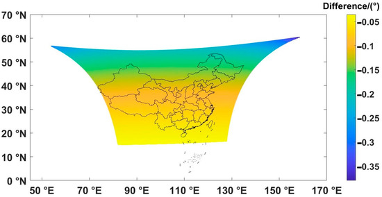 In the Beijing region, the longitudinal deviation necessitates a westward correction of 0.05°, roughly halfway between two adjacent detection points. Correspondingly, the latitudinal deviation calls for a southward correction of 0.11°, which is approximately equivalent to the distance between two vertically neighboring detection points. Furthermore, Figure 6 reveals a gradual increase in latitudinal deviation from south to north due to the widening observation angle.