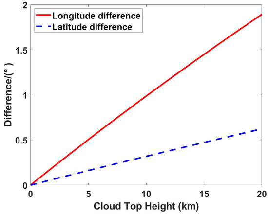At a CTH of 12 km, the most pronounced CTH deviation occurs in the northeast and northwest corners of the imager’s field of view. After implementing the CTH correction, the most substantial longitudinal deviation to the east is 0.7413°, whereas the maximum longitudinal deviation to the west is 1.1731°. Similarly, the minimum latitudinal deviation to the north is 0.0352°, and the maximum latitudinal deviation to the north is 0.3801°.