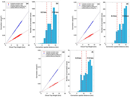 Figure 10. Correction values of latitude–longitude differences and spatial distance of LMI. (a,b) LMI event, (c,d) LMI group, and (e,f) LMI flash.