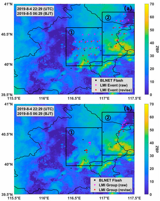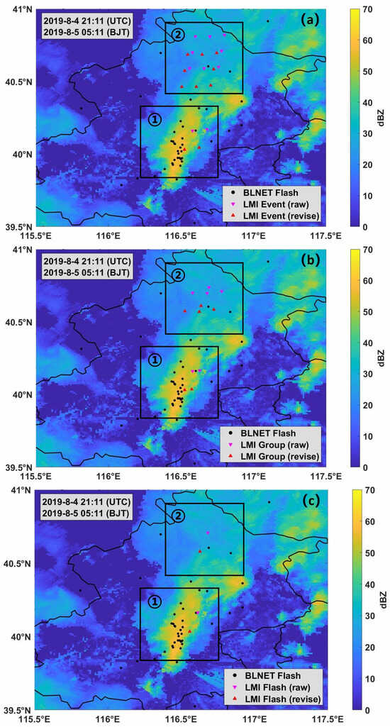Figure 12. The overlay of LMI (a) event, (b) group, and (c) flash data before and after correction with ground-based BLNET detection data and radar composite reflectivity at 22:29 on 4 August 2019. Black dots represent BLNET flash data, pink inverted triangles represent LMI data before correction, and red upright triangles represent LMI data after correction.