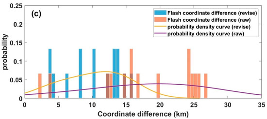 Figure 13. Distribution of coordinate differences between LMI (a) events, (b) groups, and (c) flashes before and after correction and matching with BLNET flashes. Orange indicates the distribution of coordinate differences between the original LMI data and BLNET flash data. Blue indicates the distribution of coordinate differences between the LMI data after correction and BLNET flash data. Deep orange indicates the overlapping region between orange and blue. The yellow line represents the probability curve for the blue region, while the purple line indicates the probability curve for the orange region.