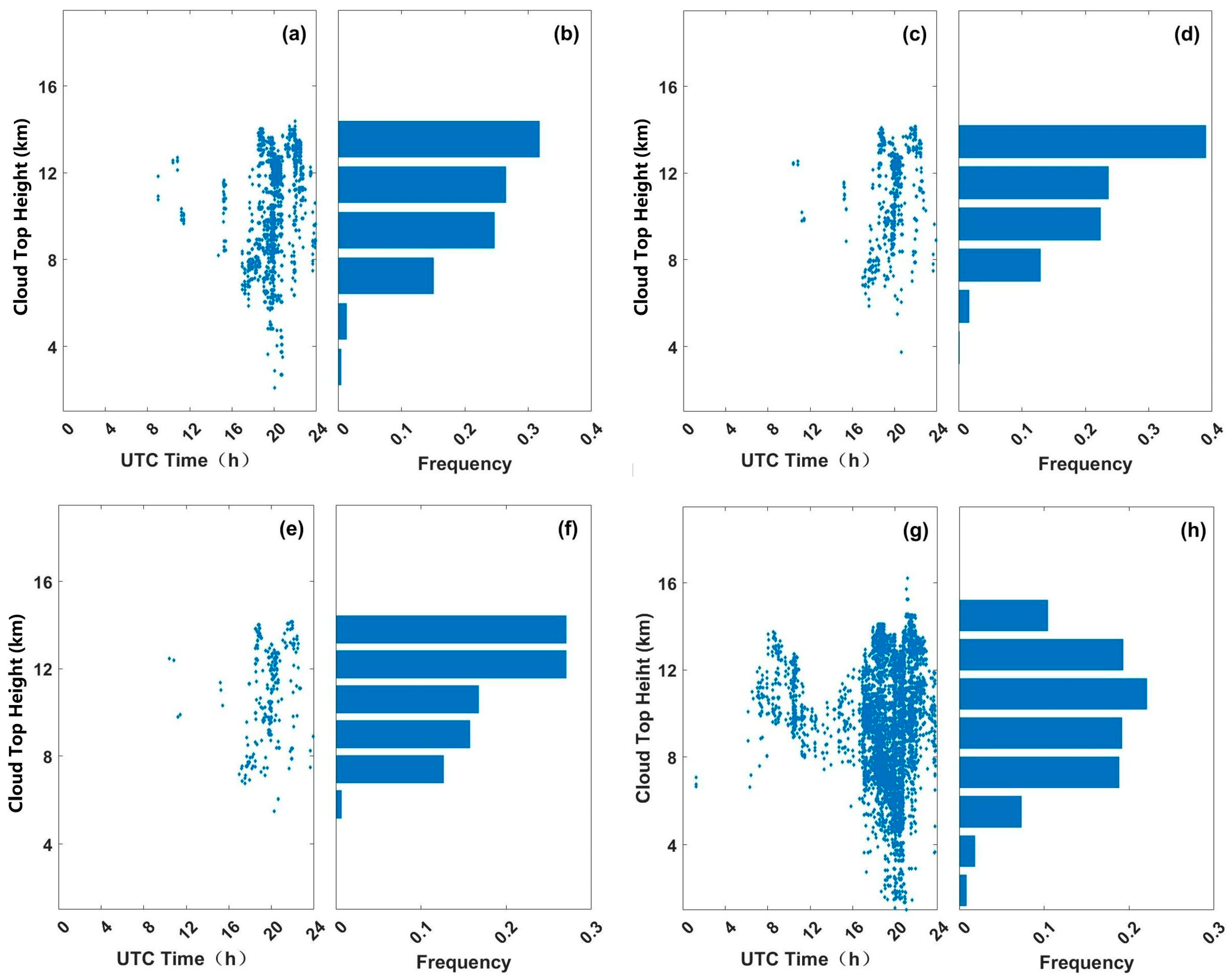 - Tan, Z.; Ma, S.; Zhao, X.; Yan, W.; Lu, W. Evaluation of Cloud Top Height Retrievals from China’s Next-Generation Geostationary Meteorological Satellite FY-4A. J. Meteorol. Res. 2019, 33, 553–562. [Google Scholar] [CrossRef]