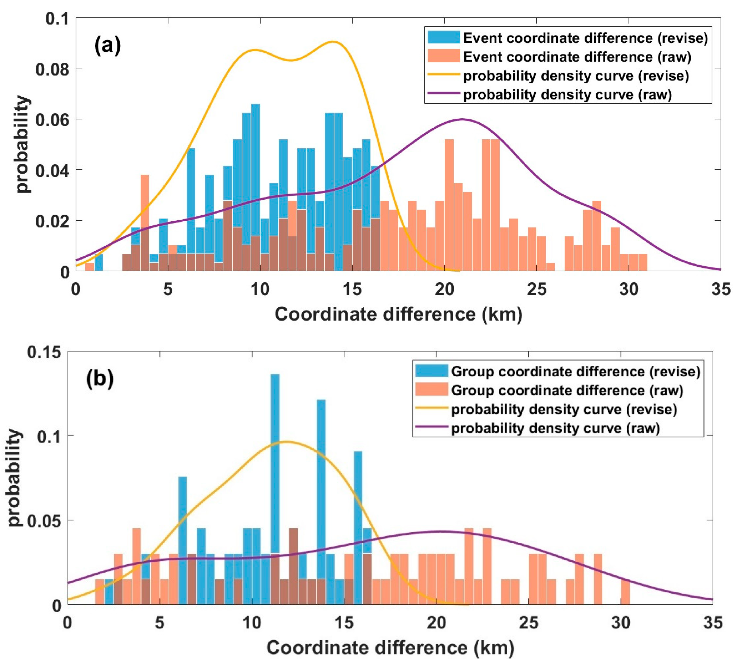 - This research systematically undertakes a quantitative assessment of the coordinate disparities among the three distinct LMI datasets and the ground-based BLNET data post correction within the context of a potent convective weather system. Notably, the coordinate disparities of the corrected data experience a substantial reduction, fostering a greater degree of convergence within the overall distribution of coordinate differences. Comparing the distribution traits of the data before and after correction across the three LMI datasets reveals a fundamental similarity. This similarity underscores the effectiveness and widespread applicability of the lightning-mapping ECPC model across all three categories of LMI data. In summary, these findings affirm the model’s efficacy and universality in ameliorating coordinate discrepancies for the diverse LMI data types, substantiating its reliability and value across various scenarios.