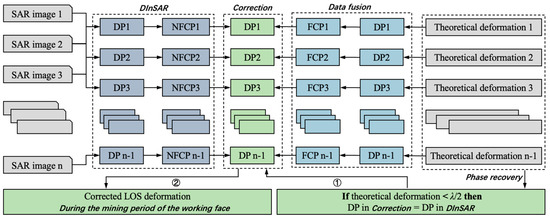 As shown in Figure 4, when correcting, we first converted the theoretical LOS deformations of the data fusion into the DPs. Second, we divided the DPs of the data fusion and the DInSAR into FCPs and NFCPs, and the results were obtained using Equations (21) and (22). Third, after replacing with , the corrected DP was obtained using Equation (23). When a deformation did not exceed λ/2, there was no need to correct it. Thus, we added an additional phase recovery step. Finally, after the DPs during the follow-up period were accumulated and converted into LOS deformations, the correction was completed.